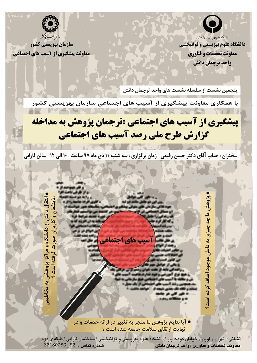 پنجمین نشست از سلسله نشست های تخصصی واحد ترجمان دانش دانشگاه علوم بهزیستی و توانبخشی ، با موضوع " پیشگیری از آسیب های اجتماعی: ترجمان پژوهش به مداخله " روز سه شنبه ( 11 دی ماه جاری ) برگزار می شود.