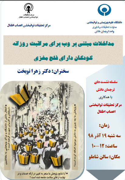 از کلیه اعضای محترم هیات علمی، دانشجویان گرامی و سایر علاقمندان دعوت به عمل می آید تا در جلسه آتی ترجمان دانش با عنوان : مداخلات مبتنی بر وب برای مراقبت روزانه کودکان دارای فلج مغزی که در روز سه شنبه تاریخ 19 / 9 / 98 ساعت 10 الی 12 برگزار می گردد، شرکت فرمایند .