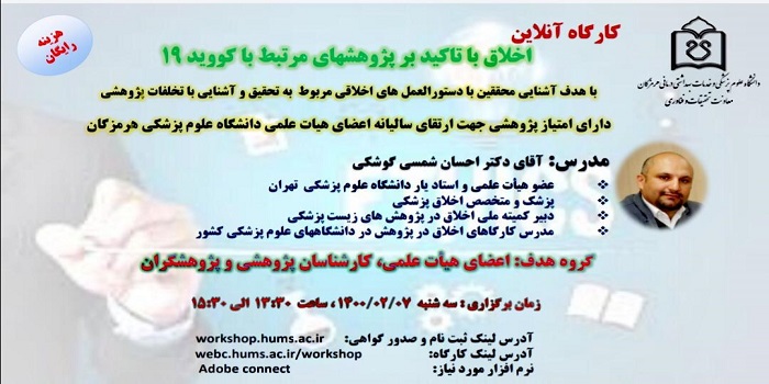 برگزاری کارگاه آنلاین اخلاق با تاکید بر پزوهش های مرتبط با کووید 19 توسط دانشگاه علوم پزشکی و خدمات بهداشتی درمانی هرمزگان
