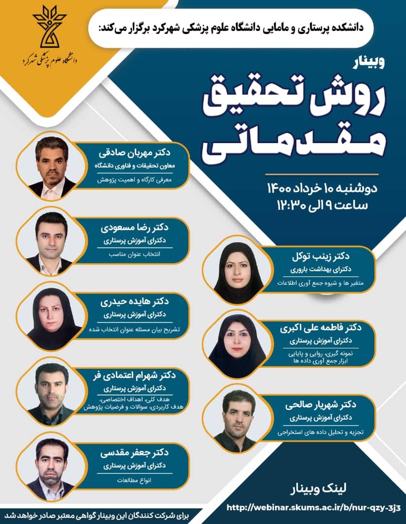 به اطلاع میرساند ، وبینار" کارگاه روش تحقیق مقدماتی " در تاریخ 1400/3/10 توسط دانشکده پرستاری و مامایی دانشگاه علوم پزشکی شهر کرد با همکاری معاونت تحقیقات و فناوری این دانشگاه برگزار خواهد شد .