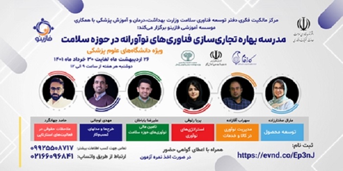 به گزارش روابط عمومی معاونت تحقیقات و فناوری وزارت بهداشت، مرکز مالکیت فکری دفتر توسعه فناوری سلامت معاونت تحقیقات و فناوری وزارت بهداشت با هدف آشنایی عمومی محققان و فناوران دانشگاه های علوم پزشکی کشور با مباحث مرتبط با تجاری سازی فناوری های نوآورانه و نقش مدیریت فناوری و نوآوری اقدام به برگزاری سلسله وبینارهای مدرسه بهاره مرکز مالکیت فکری کرده است.