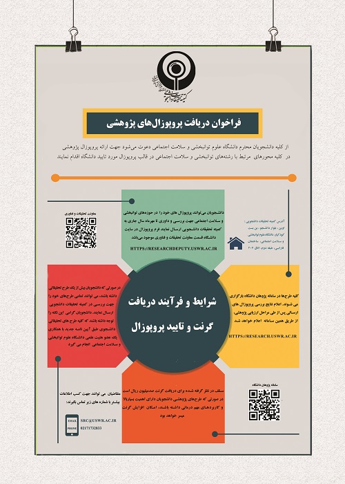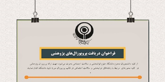 از کلیه دانشجويان محترم دانشگاه علوم توانبخشی و سلامت اجتماعي دعوت میشود جهت ارائه پروپوزال پژوهشی در كليه محورهاي مرتبط با رشتههای توانبخشی و سلامت اجتماعي در قالب پروپوزال مورد تاييد دانشگاه اقدام نمايند