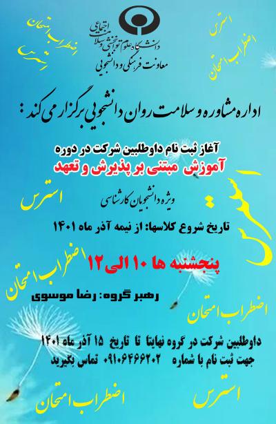 اخبار > برگزاری دوره " آموزش مبتنی بر پذیرش و تعهد " از نیمه دوم آذرماه / مهلت ثبت نام تا 15 آذرماه جاری