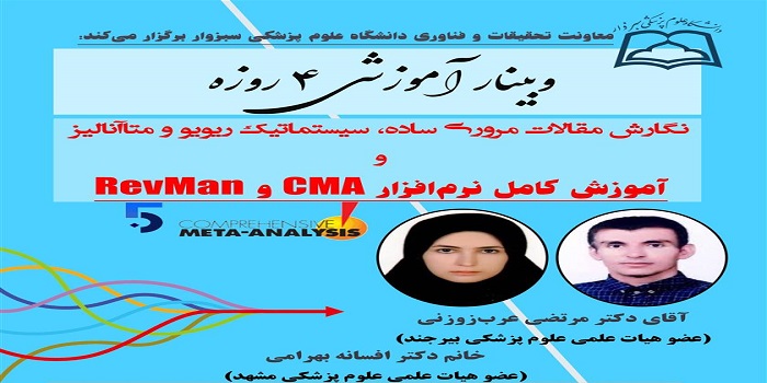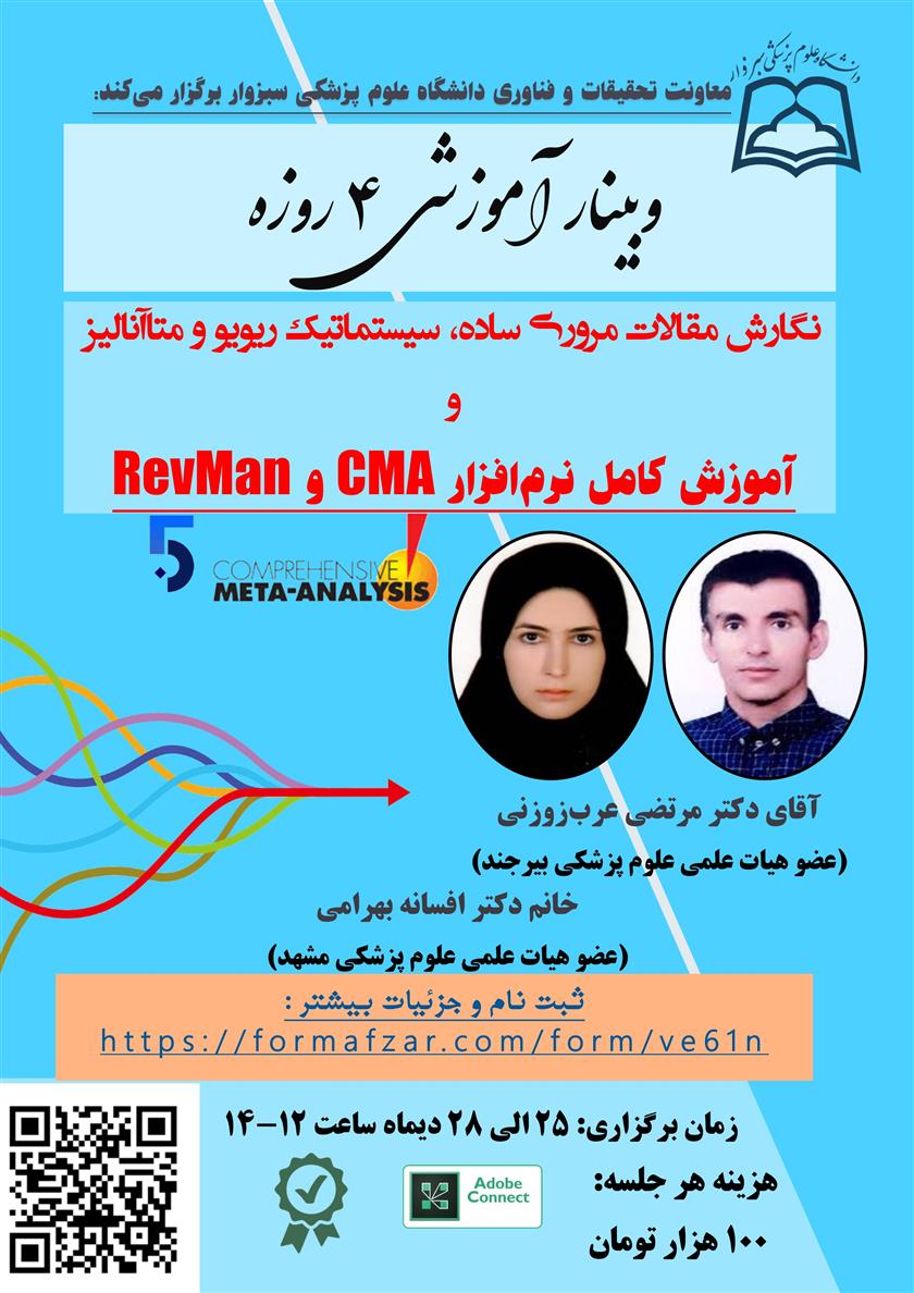 معاونت تحقیقات و فناوری دانشگاه علوم پزشکی سبزوار در نظر دارد ، وبیناری با عنوان"نگارش مقالات مروری ساده، سيستماتيک، ريويو و متاآناليز و آموزش کامل نرم افزار CMAو RevMan"در مورخ 25/10/1401الی 28/10/1401ساعت 14-12در بستر اداب کانکت برگزار نماید. علاقمندان درصورت هرگونه سوال و ابهام می توانند با خانم گودرزیان با شماره 44018131 تماس حاصل فرمایند.