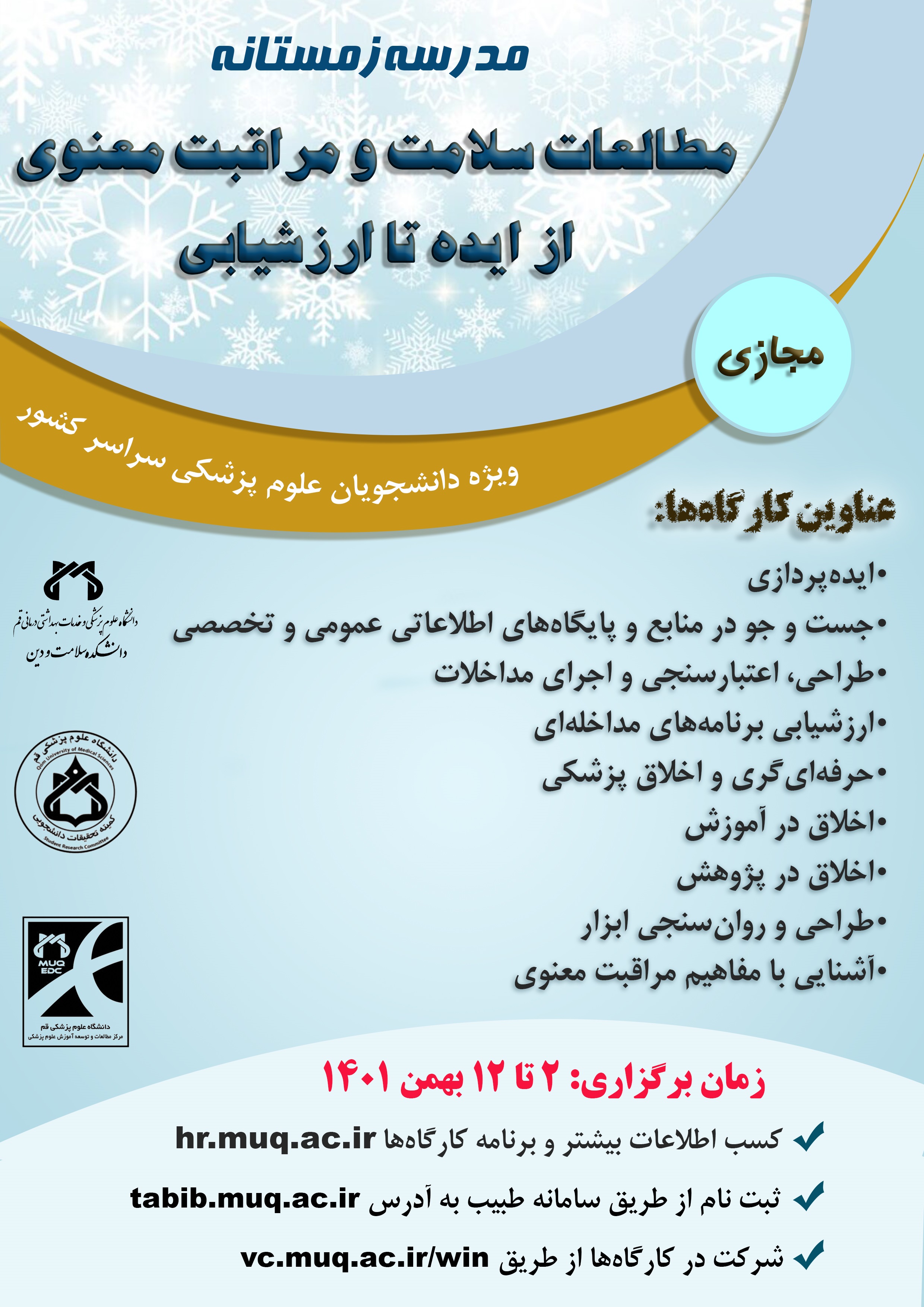 مرکز مطالعات و توسعه آموزش علوم پزشکی، کمیته تحقیقات دانشجویی و دانشکده سلامت و دین، مدرسه زمستانه سلامت و مراقبت معنوی از ایده تا ارزشیابی را از دوم تا دوازدهم بهمن ماه برگزار میکند. این دوره که به صورت کارگاههای مجازی روزانه برگزار می شود ویژه تمام دانشجویان علوم پزشکی سراسر کشور است.