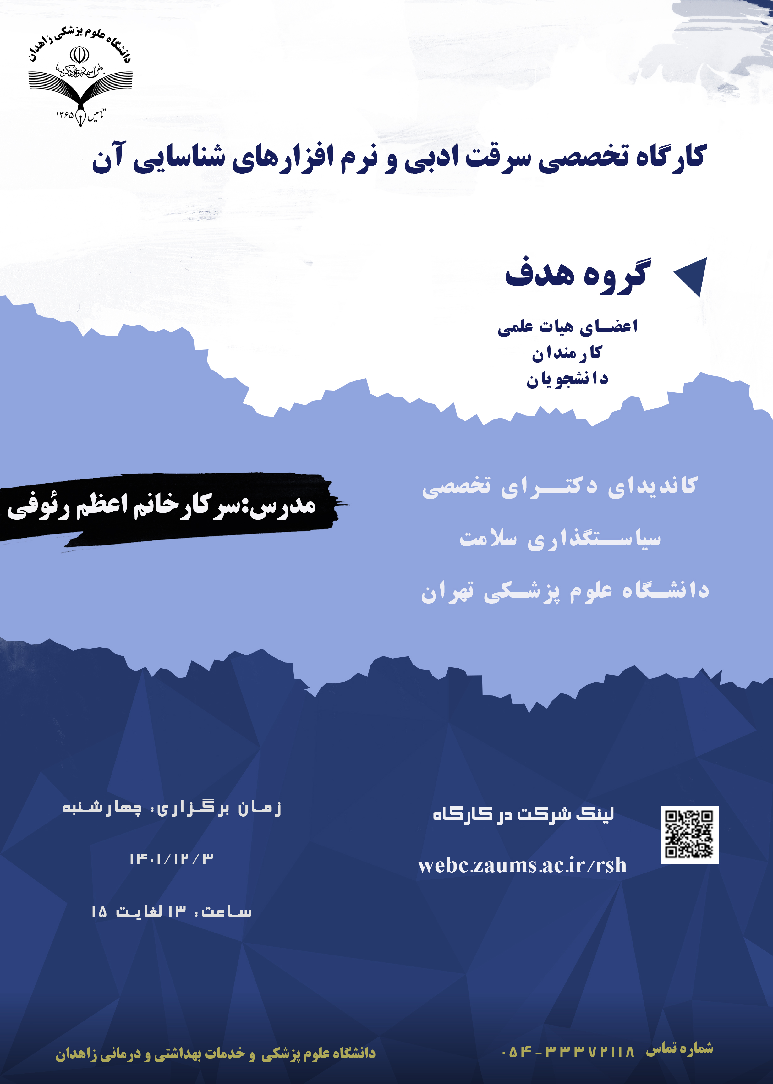 به اطلاع علاقمندان میرساند : کارگاه آنلاین " تخصصی سرقت ادبی و نرم افزارهای شناسایی آن "ویژه اعضای محترم هییت علمی و دانشجویان و کارمندان ، توسط معاونت تحقیقات و فناوری دانشگاه علوم پزشکی زاهدان برگزار می کردد . لطفا جهت ثبت نام و کسب اطلاعات بیشتر به وبسایت دانشگاه مربوطه مراجعه نمایید.