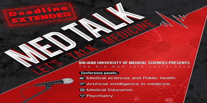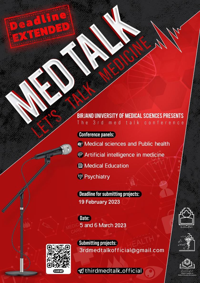 به اطلاع عموم علاقمندان ، پژوهشگران و اعضای محترم هییت علمی میرساند ، کمیته تحقیقات و فناوری دانشجویی دانشگاه علوم پزشکی بیرجند در نظر دارد " سومین رویداد بین المللی MED Talk " را در روزهای یکشنبه و دوشنبه مورخ 14و 15 اسفند ماه 1401 از ساعت 16 الی 20 برگزار نماید . علاقمندان میتوانند جهت کسب اطلاعات بیشتر به سایت دانشگاه فوق مراجعه نمایند .