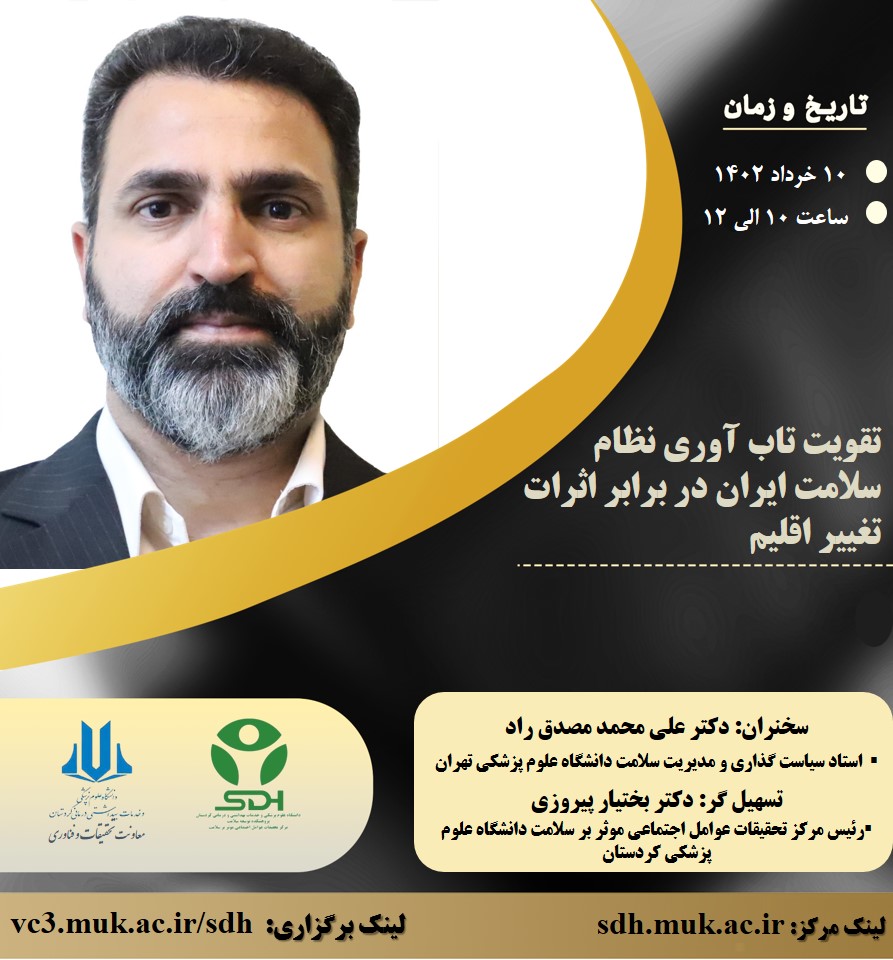 به اطلاع علاقمندان ، اساتید محترم و دانشجویان میرساند : مرکز تحقیقات عوامل اجتماعی موثر بر سلامت معاونت تحقیقات و فناوری دانشگاه علوم پزشکی کردستان در نظر دارد تا وبیناری تحت عنوان " تقویت تاب آوری نظام سلامت ایران در برابر اثرات تغییر اقلیم " در تاریخ چهارشنبه ۱۰ خرداد ۱۴۰۲ ساعت ۱۰ الی ۱۲ با تدریس جناب آقای دکتر علی محمد مصدق راد عضو هیئت علمی دانشگاه علوم پزشکی تهران برگزار نماید. علاقمندان می توانند جهت شرکت در این وبینار به لینک ذیل مراجعه نمایند .