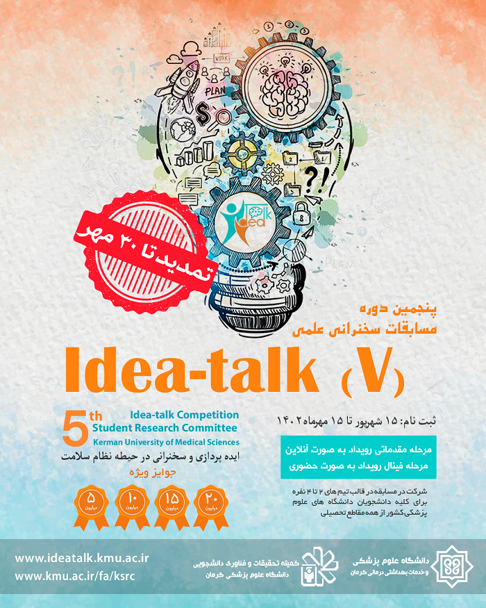 پنجمین دوره مسابقات سخنرانی علمی کمیته تحقیقات و فناوری دانشجویی دانشگاه علوم پزشکی کرمان ویژه دانشجویان تمام مقاطع تحصیلی دانشگاه های علوم پزشکی کشور در پاییز ۱۴۰۲ برگزار می گردد. زمان ثبت نام این رویداد از ۱۵ شهریور ماه آغار شده است و تا ۳۰ مهر ماه تمدید می گردد. مرحله مقدماتی در تاریخ ۱۸ آبان ماه و مرحله نهایی در تاریخ ۹ آذرماه برگزار خواهد شد. چهار تیم منتخب مرحله فینال مسابقات ضمن دریافت تندیس و لوح تقدیرنامه از طرف معاونت تحقیقات و فناوری دانشگاه علوم پزشکی کرمان و کمیته تحقیقات و فناوری دانشجویی دانشگاه، جوایز نقدی ۲۰ ،۱۵ ،۱۰ و ۵ میلیون تومانی دریافت خواهند کرد.