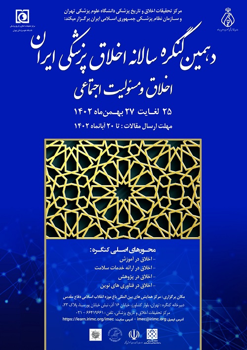 دهمین کنگره سالانه اخلاق پزشکی ایران با شعار «اخلاق و مسئولیت اجتماعی»، و با محورهای «اخلاق در آموزش»، «اخلاق در ارائه خدمات سلامت»، «اخلاق در پژوهش» و «اخلاق در فناوریهای نوین» به میزبانی مرکز تحقیقات اخلاق و تاریخ پزشکی و سازمان نظام پزشکی جمهوری اسلامی ایران و با همکاری فرهنگستان علوم پزشکی، معاونت پرستاری وزارت بهداشت و بنیاد حکمت تاریخ و اخلاق پزشکی، از 25 الی 27 بهمن 1402 در مرکز همایشهای بینالمللی باغ موزه انقلاب اسلامی دفاع مقدس برگزار میشود. همچنین مهلت ارسال مقالات تا 20 آبان است.