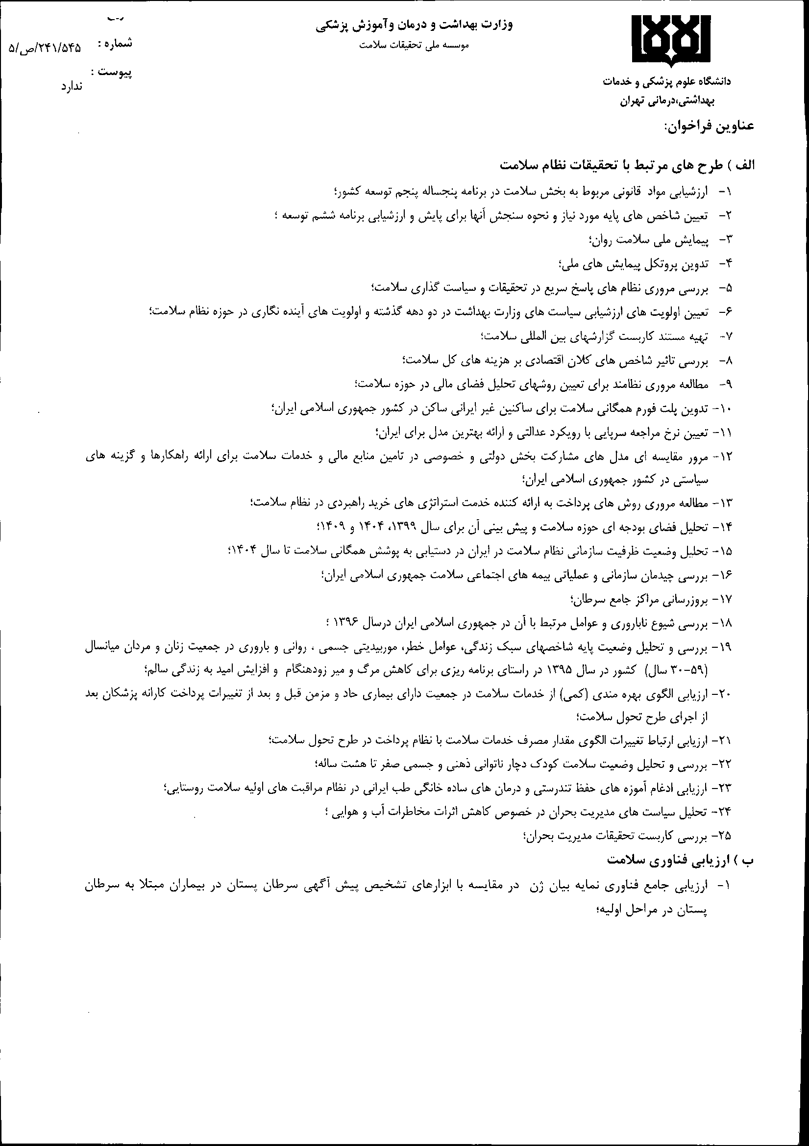 موسسه ی ملی تحقیقات سلامت وزارت بهداشت درمان وآموزش پزشکی فراخوان طرح پژوهشی را برگزار میکند.