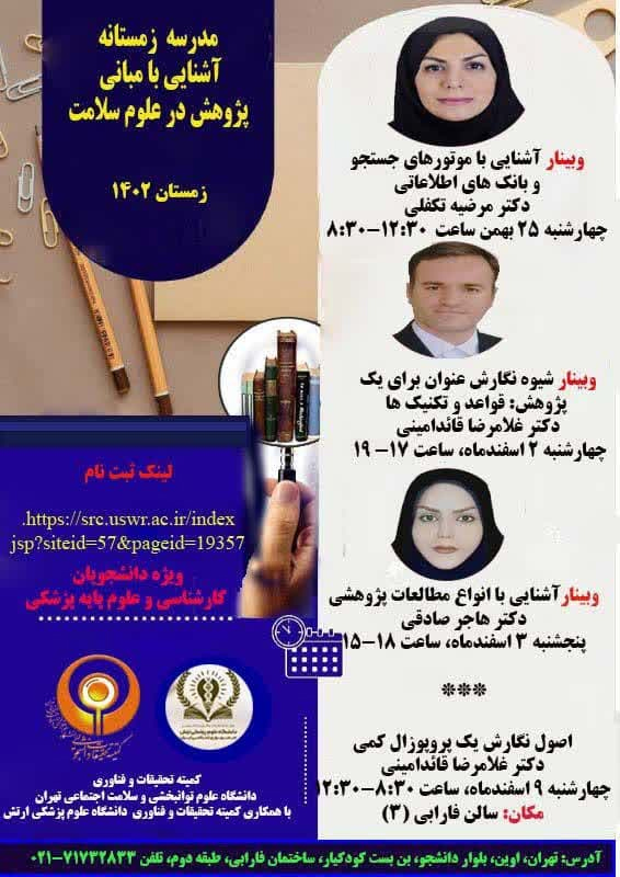 Aims: To establish an academic platform and make a scientific network for sharing and transferring and exchanging knowledge in the field of the health in disaster and emergency and to facilitate diffusion of research results among researchers.